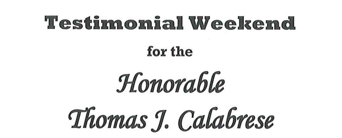 The highlight of the weekend will be the Testimonial Banquet honoring The Honorable Thomas J. Calabrese. The evening begins with a Social Hour at 5:30 p.m., followed by Dinner and Entertainment at 6:30 p.m. Formal attire is requested to mark this distinguished occasion. Tickets are $60 per person.